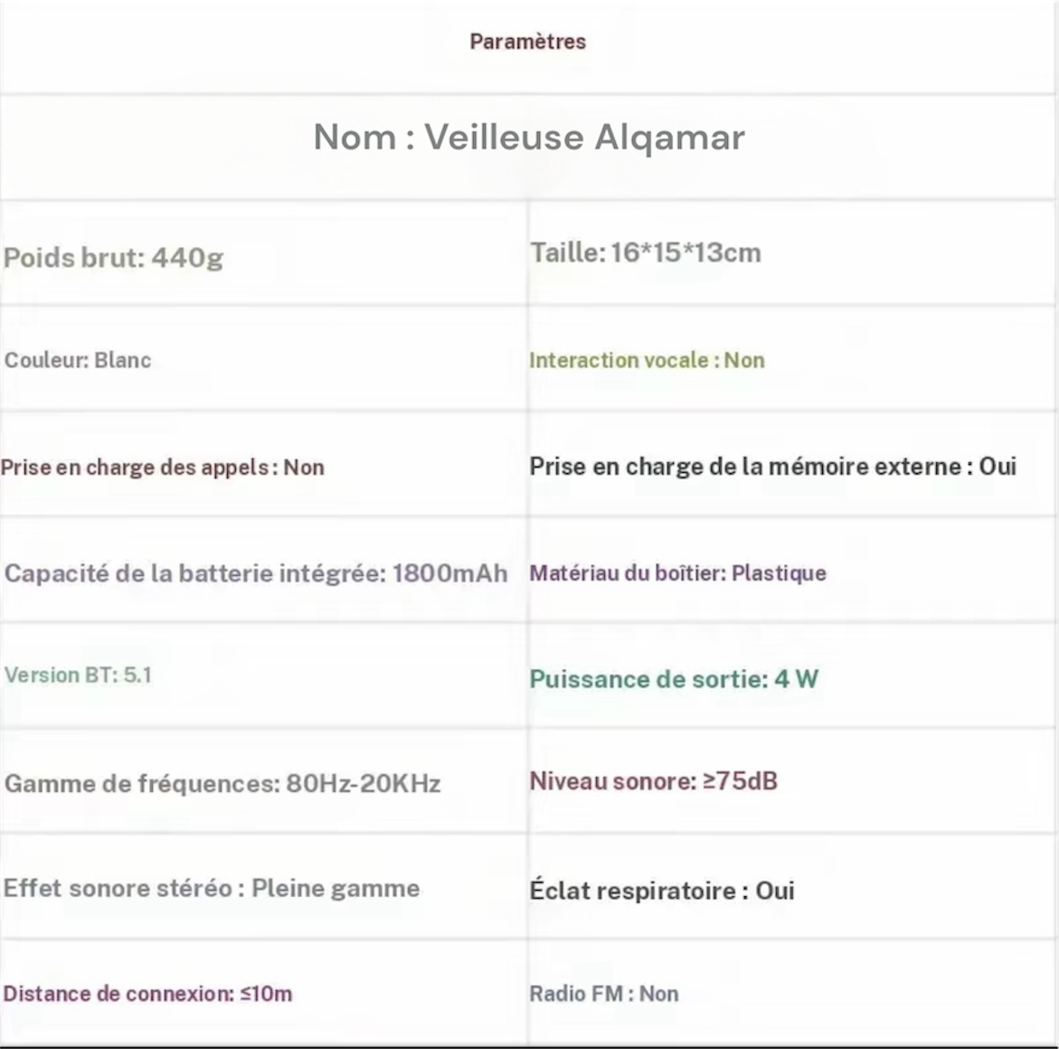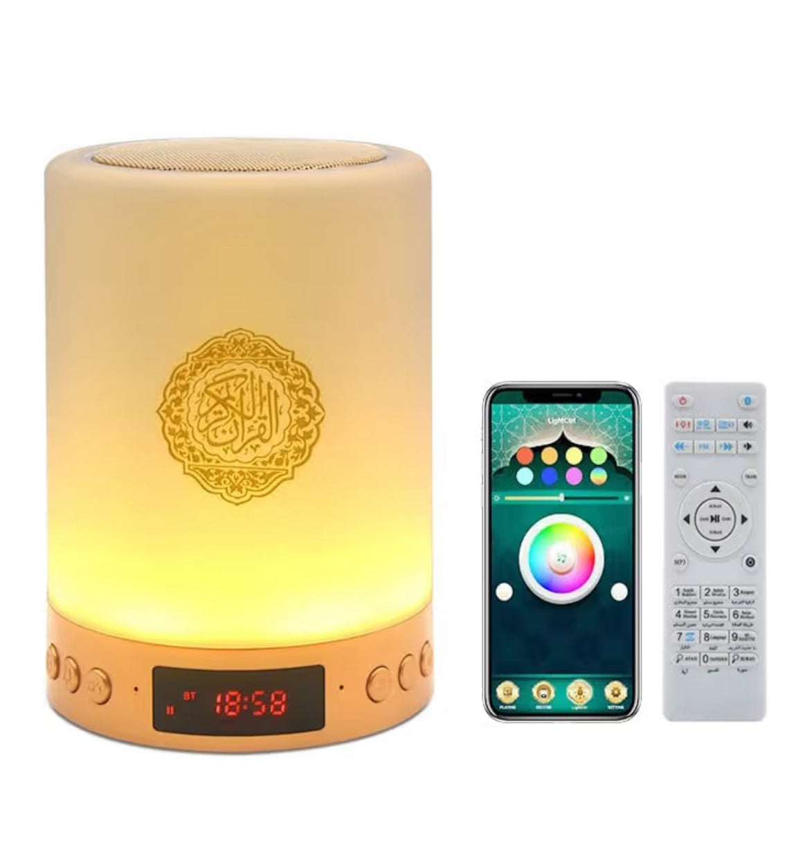 Cette veilleuse diffuse une lumière douce et les récitations de grands cheikhs tels que Dr AbdurRahman As-Sudais, Dr Maher Al Mu’aiqily, et bien d’autres. Le produit peut être utilisé autonomement, grâce à sa mémoire intégrée, sans téléphone ni Wi-Fi, pour accompagner votre enfant dans l’apprentissage du Coran et créer des nuits paisibles et spirituelles. Il peut également être connecté à une application via Wi-Fi ou Bluetooth pour un usage plus interactif et personnalisé.